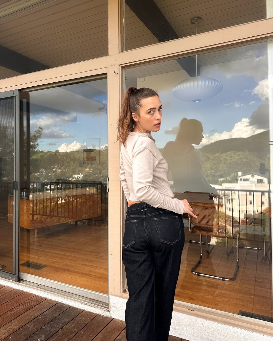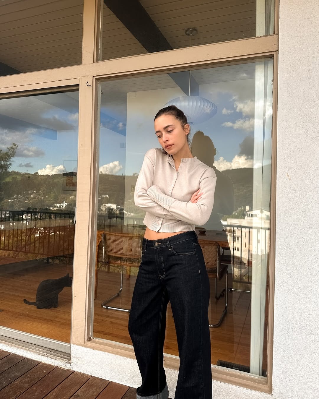 Lioness, the Sydney-born powerhouse since 2009, masters that intoxicating blur between elevated everyday staples and sultry after-dark glamour, channeling bold, body-conscious silhouettes with an unapologetic Australian ease. Enter @lerapen stepping out in pure cool-girl alchemy: the Head in the Clouds Cardigan in Cloud ($75), a midweight knit marvel blending 49% viscose, 28% polyester, and 23% nylon for a plush, machine-washable hug. Its cropped, fitted silhouette with ribbed waist, wide hems, cuffs, and effortless front snap buttons drapes sensually over the frame, offering V-neck allure that's equal parts minimal and magnetic. Paired with the Top Model Cuffed Jean in Dark Denim, this duo nails a sharp, cuff-hemmed fit that's leggy yet laid-back—perfect for coffee runs morphing into sunset spritzes. It's confidence in motion: versatile for boardroom-to-bar transitions, embodying Lioness' signature night-out edge wrapped in daytime nonchalance.