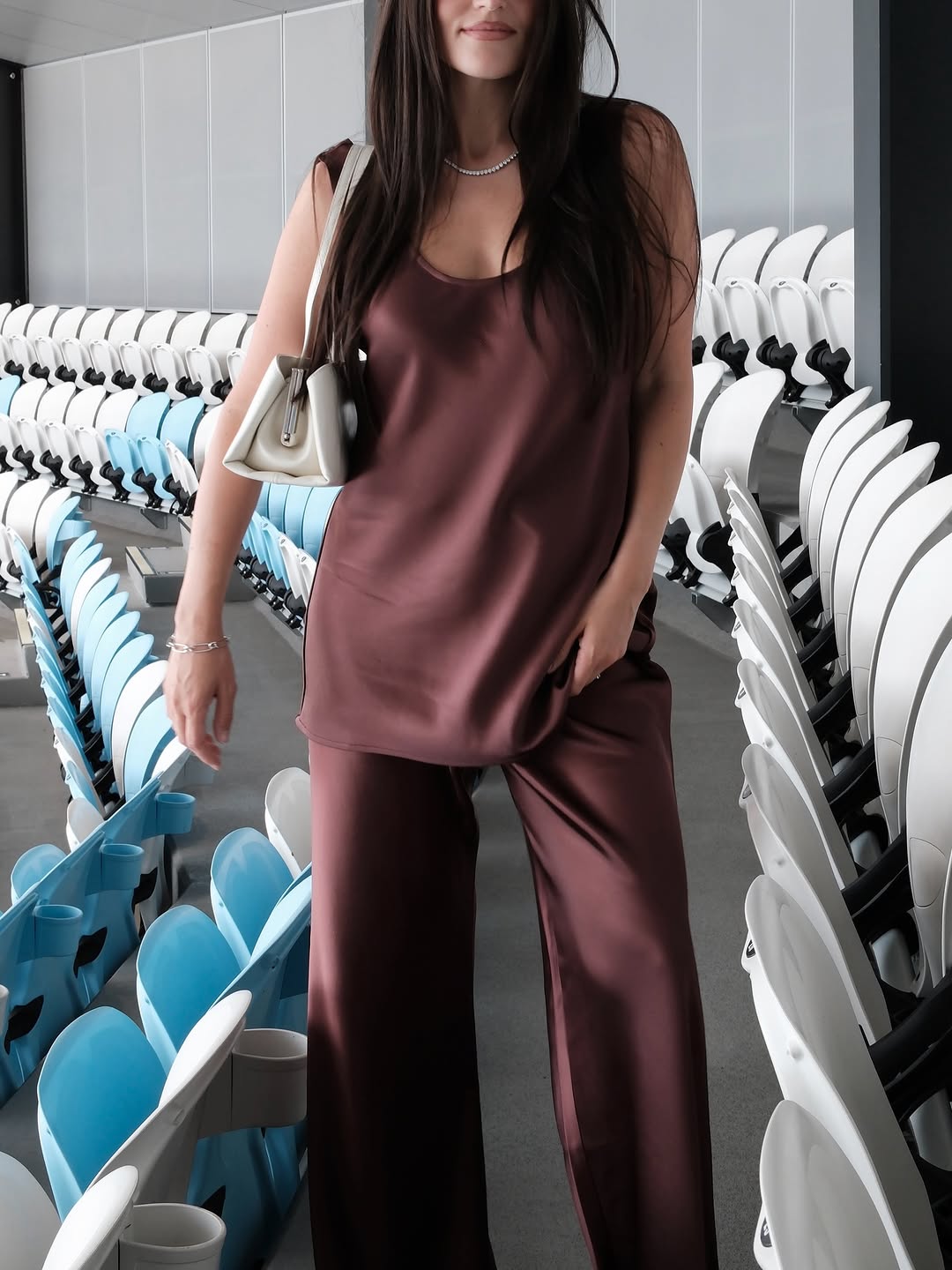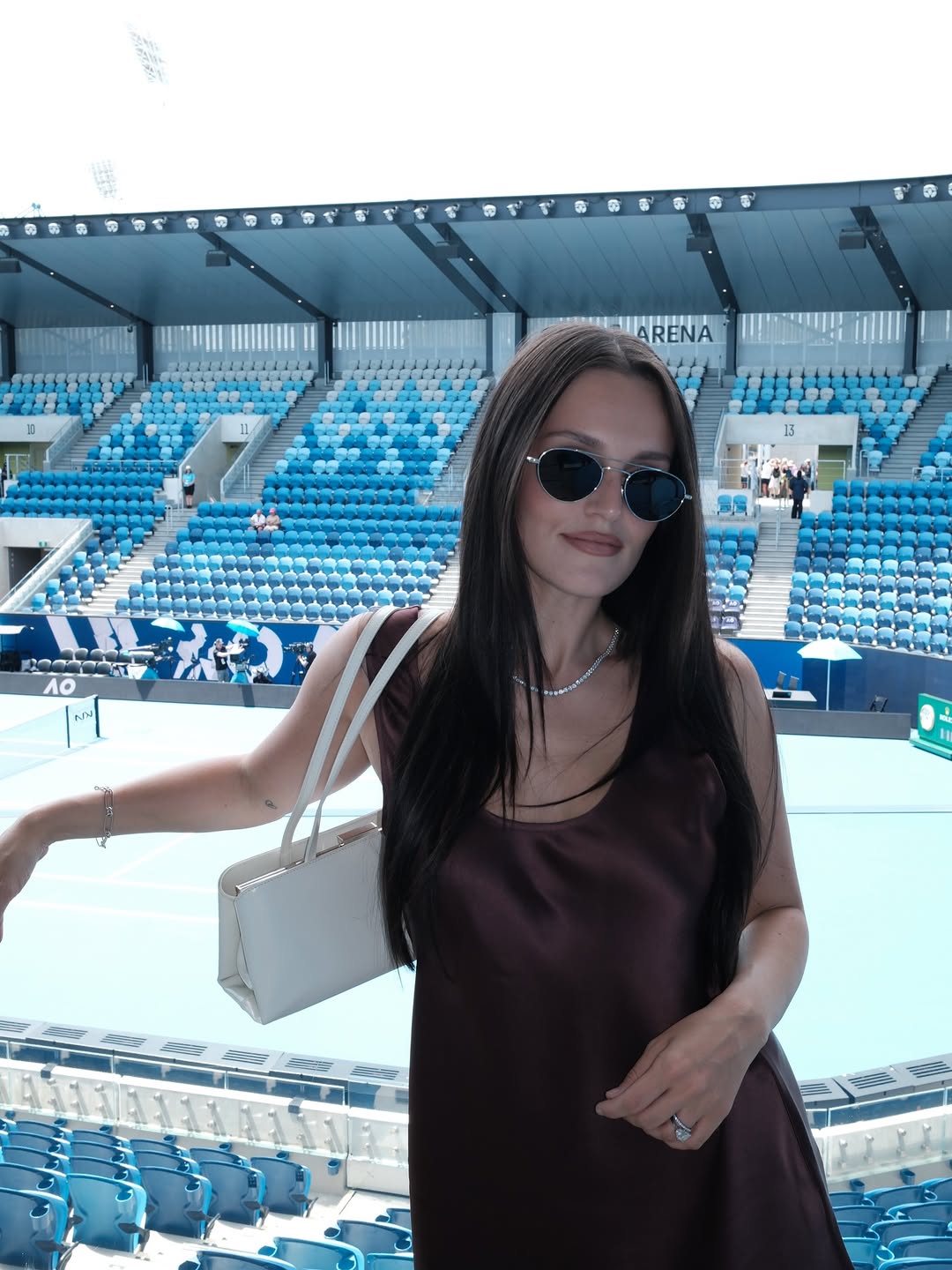 Shona Joy, founded in Sydney in 2000, has long mastered elevated eventwear that marries modern femininity with effortless wearability—its signature fluid satins, sculpted bodices, and relaxed tailoring delivering contemporary elegance, understated sensuality, and directional ease. Enter the Lani Mini Dress ($151), a courtside standout echoing influencer Katherine Denton's espresso-hued Savanna Scoop Neck Tank and Bias Pant moment. Crafted from a soft, stretch-infused self fabric (49% cotton, 48% polyester, 3% elastane) with a breathable lining (65% cotton, 32% nylon, 3% elastane), it boasts a sculpted yet fluid fit that hugs the body with soft structure, flaring into a playful mini hemline for unrestricted movement. Perfect for high-energy occasions like tennis matches or seamless transitions to evening drinks, this hand-washable, China-made gem embodies the brand's refined palette and considered construction—effortless polish that turns heads without trying.