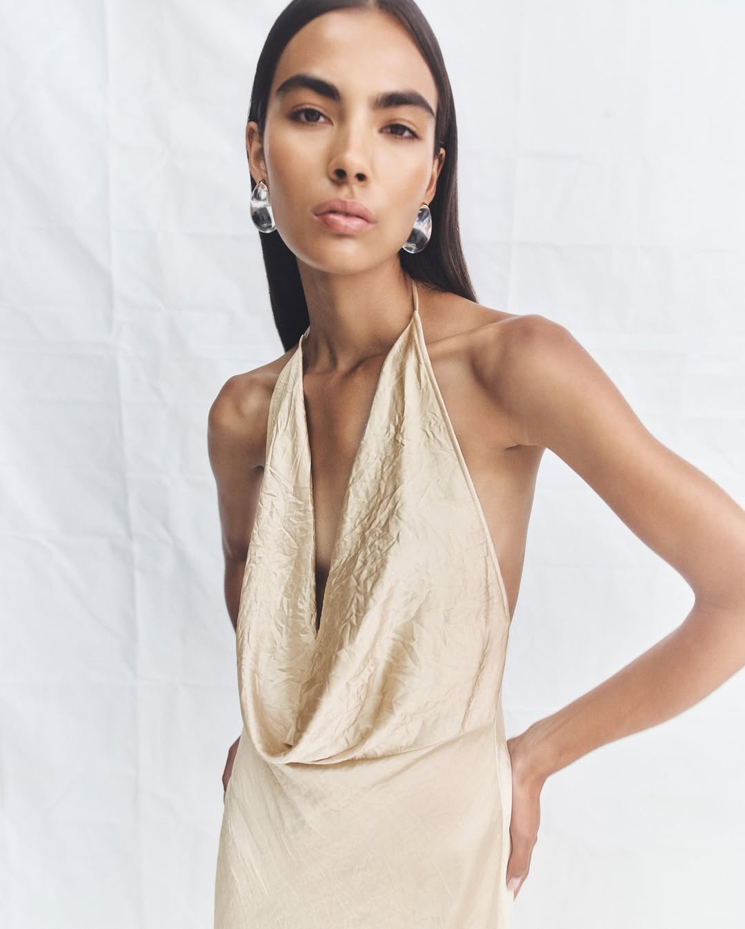 Shona Joy, the Sydney-born powerhouse since 2000, masters elevated eventwear that fuses modern femininity with effortless wearability—think fluid satins, sculpted bodices, and relaxed tailoring in a refined palette of contemporary elegance and understated sensuality. Enter 'Andie,' a vision in champagne tones with that irresistible crushed and crinkled finish, capturing directional ease for seamless occasion-hopping. The star is the La Lune High Neck Midi Dress at $320, crafted from 58% Lenzing Ecovero viscose and 42% viscose for a soft, structured drape that's partially lined with a sultry split back—hand wash for preserved luxury. Echoing the vibe, the Savanna Halter Open Back Maxi Dress ($344) in satin delivers fully lined sophistication with a hidden zipper and adjustable buckles, perfect for evenings that linger. Meanwhile, the La Lune Cross Front Keyhole Midi ($154) and Cowl Neck Midi ($145) offer pull-on versatility with cut-outs and cowl drama, all in breathable blends ideal for summer soirees. Effortless, sensual, and utterly wearable—these pieces move from brunch to black-tie with Shona Joy's signature poise.
