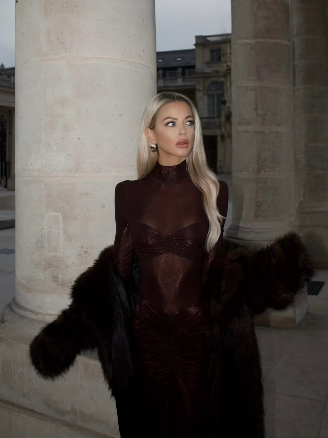 Delfi Collective, the late-2010s New York phenom, redefines sculptural eveningwear with body-conscious maxi dresses in satin jersey, metallic knits, and fluid chiffons—ruching, halter necks, and sheer accents channeling sultry minimalism, modern glamour, and nocturnal elegance. From Paris with that irresistible 🤎 hue (#oldmoneystyle vibes), the Jadienne Dress ($338) steals the scene in 100% polyester with front ruched detailing, partial lining, and a hidden back zip for a dry-clean-only, curve-sculpting fit that moves from downtown haze to red-carpet grace. Complementing it, the MAXIVESTIDO MYLA ($260)—96% polyester/4% spandex self, 90% nylon/10% spandex lining, made in the USA—drapes with unapologetic femininity and effortless fluidity. This classy, timeless OOTD is your ticket to occasions demanding whisper-sexy sophistication and bold allure.