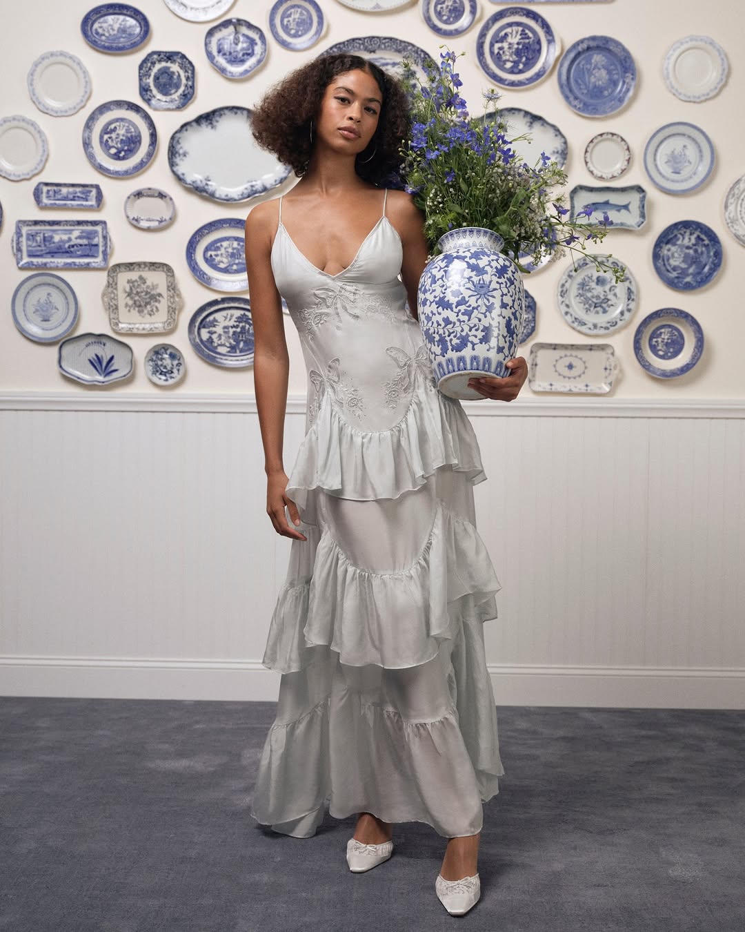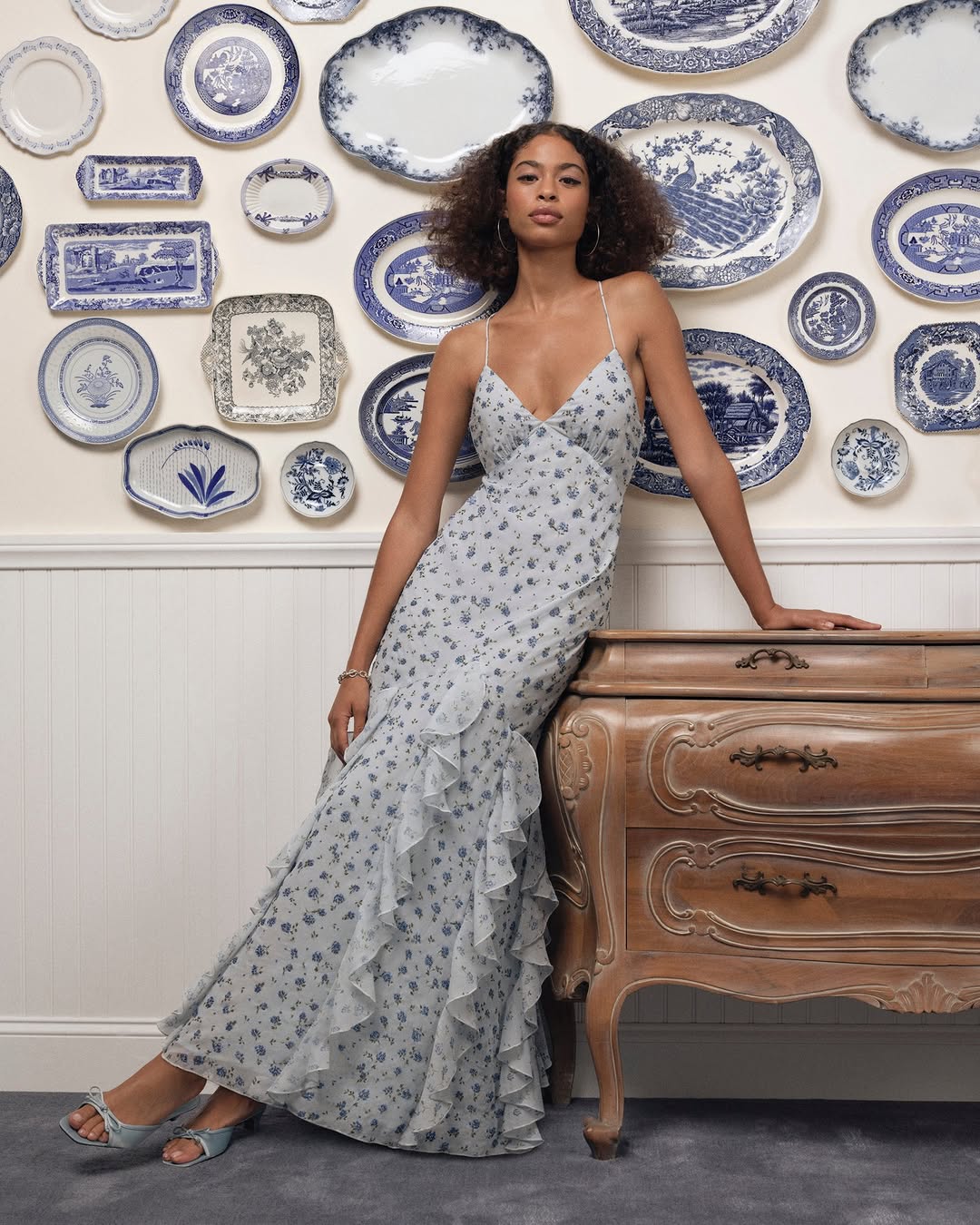 For Love & Lemons, the Los Angeles-born darling of lingerie-inflected glamour since 2011, masterfully blends vintage romance with provocative sensuality through lace, embroidery, and sculpted bodices that whisper underwire allure and sheer chiffon dreams. Dive into their keepsakes collection, where intricate beading and romantic silhouettes in captivating blue hues craft pieces meant to be cherished. The Tea Time Midi Dress ($289) captivates with its lightweight woven fabric and corset-fitted bodice, hugging curves for intimate soirées. Echoing floral fantasy, the Rosalyn Maxi Dress ($297) seduces via sleeveless midi lines, lace panel inserts, and a plunging V-neck perfect for moonlit escapes. For lighter whimsy, the Becka Mini Dress ($101) in cotton-nylon blend offers playful contrast, while the Doily Bouquet Midi Dress ($192) in fully lined recycled polyester delivers adjustable straps and hidden zippers for effortless elegance. These fits—tailored, feminine, unapologetically glamorous—are your go-to for romantic nights demanding something unforgettable.