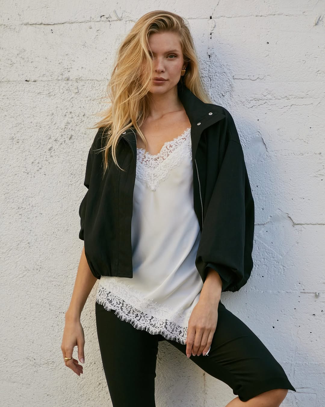 ASTR The Label, the Los Angeles darling founded in 2012, excels at polished day-to-night silhouettes that fuse romantic minimalism with contemporary femininity and effortless city-ready layering. When basics fall short—like with the cheeky nod to the Analise Tank—this ensemble elevates through masterful textures and fits. Start with the Roya Top ($98), a 100% viscose satin stunner with front tie detail and eyelet collar for soft, structured allure. Beneath or peeking through, the Antoinette Top ($98) in cotton-nylon delivers intentional sheerness and button-down polish. The Meira Vest ($101) adds cotton precision with scalloped hems and midweight structure, while the Lacey Cardigan ($109)—a polyester-acrylic-wool knit—drapes with versatile contrast. This vibe screams repeat-wear versatility: tailored yet forgiving fits for morning meetings to sunset cocktails, blending tactile luxury with urban ease.