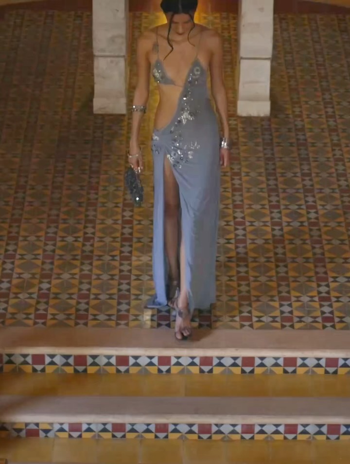 Jaded London, the irreverent London label that's been igniting the clubwear-streetwear crossover since 2013, masters unapologetic sensuality in this youth-driven ensemble, blending sheer mesh experimentation with body-conscious corsetry vibes. Picture the lightweight, tropical-detailed Celina Wrap Top ($41) in 100% polyester, its tie-closure draping provocatively over the flirty Bardot Hanky Hem Dress ($145), complete with drawstring waist and cuffs for that cinched, playful fit. Layer in the sultry Cindy Plunge Maxi Dress ($170)—90% polyester with elastane stretch and halterneck ties—for elongated drama, then shrug on the cozy yet edgy Chuck Cardigan ($125), a knit blend of acrylic, polyamide, and polyester with front buttons for transitional ease. This high-impact look, all metallics-meets-cutouts confidence, screams digital-age aspiration: perfect for AMARA's exclusive app drops, late-night raves, or urban prowls where sheer layers blur boundaries between tease and triumph.