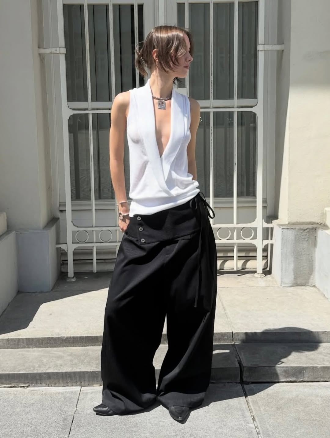 GEEL, the Los Angeles-born label from the early 2020s, epitomizes elevated minimalism with softly sculpted essentials—tailored trousers and slinky jersey tops in muted neutrals that fuse structure with effortless drape, understated sensuality, and modern restraint for body-aware everyday dressing. Nina van Berkel's luminous moment in the Serra Tunic captures this vibe perfectly, echoing the collection's tactile prowess: slip into the $152 Kennedy Pant, its 95% polyester-5% spandex blend with cotton lining delivering a high-rise, zip-fly fit that's precisely tailored yet forgivingly stretchy. Pair it with the $137 Andy Trouser in smooth matte black for high-waisted, fluid utility, or elevate with the $97 Marcelo Halter—a sleeveless wool-acrylic knit with V-neck allure and fitted waist. For softer sensuality, the $89 Webster Top in lightweight modal-spandex offers ruched-back detail and wrap-front drape. These pieces, rooted in quiet luxury, suit transitional occasions from boardroom poise to evening ease, their materials caressing the form with restrained elegance.