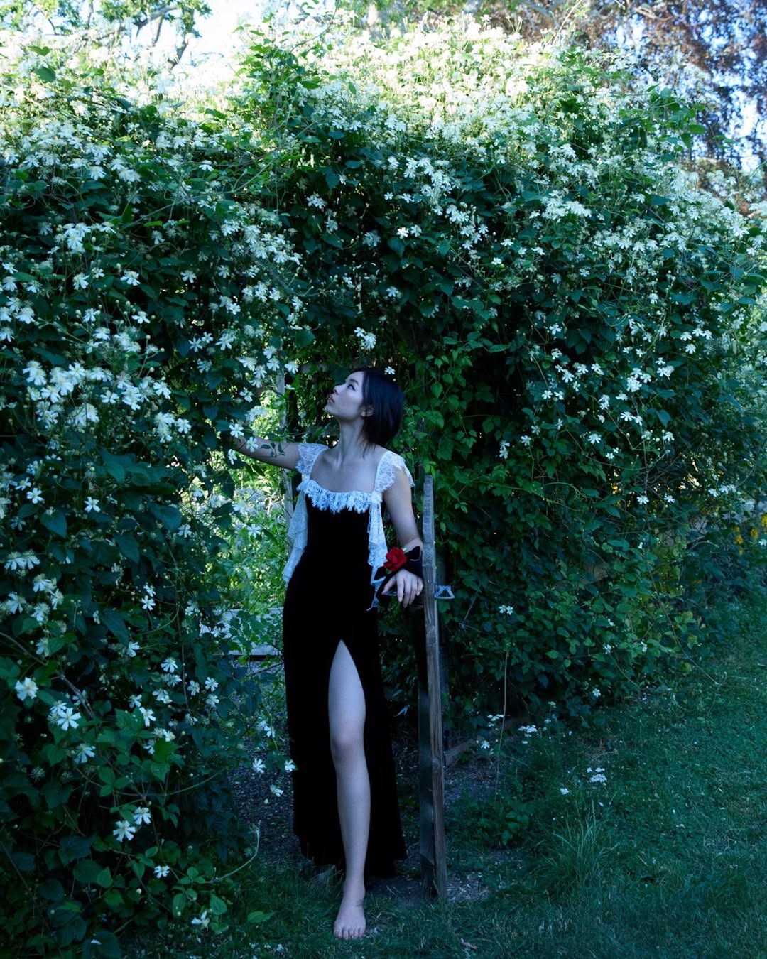 Self: 49% nylon, 41% polyester, 10% spandexLining 1: 98% recycled polyester, 2% spandexLining: 100% polyesterLining 3: 100% recycled polyester Made in China Dry clean Fully lined Hidden back zipper closure with tie detail Lightweight flocked georgette textile with tulle and chiffon lining Boned bodice with underwire cupGathered skirt design Revolve Style No. FORL-WD1461 Manufacturer Style No. CD4006-SP26-WHITE