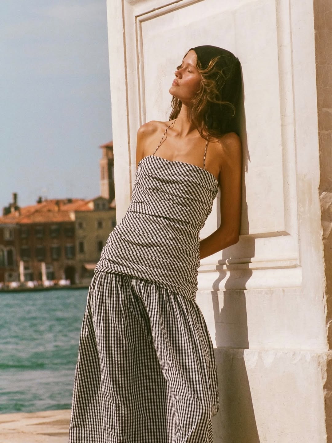 100% cotton Hand wash cold Unlined Smocked elastic bodice Side seam pockets Midweight poplin fabric Neckline to hem measures approx 47" in length Made in IndonesiaRevolve Style No. FAIB-WD775 Manufacturer Style No. FF3960-CLS