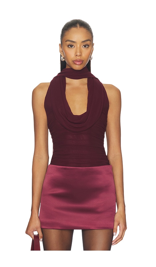 Halter top constructed from a lightweight knit fabric. Features a draped cowl neckline that extends into a halter strap. 90% nylon 10% elastane.Made in China.Dry clean.Scarf styling with cowl neck detail