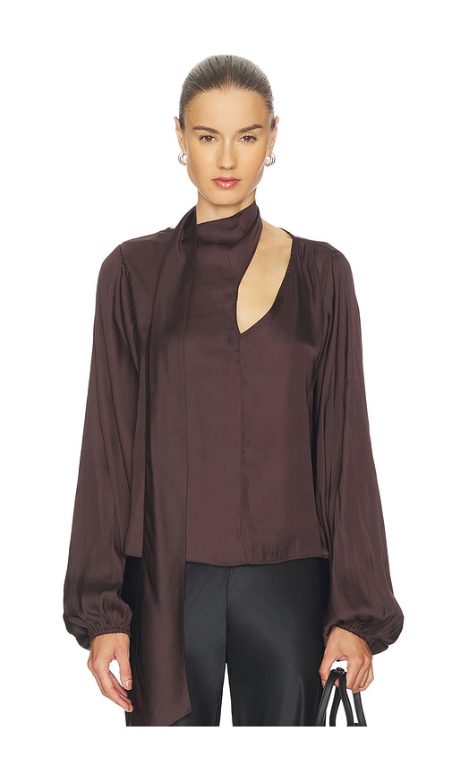Long sleeve top constructed from a lightweight woven fabric with a subtle sheen. Features an asymmetrical neckline with a self-tie detail and gathered cuffs. 100% polyester.Made in Vietnam.Machine wash.Asymetric plunging neckline.Attached neck scarf.Satin textile.Elastic cuffs