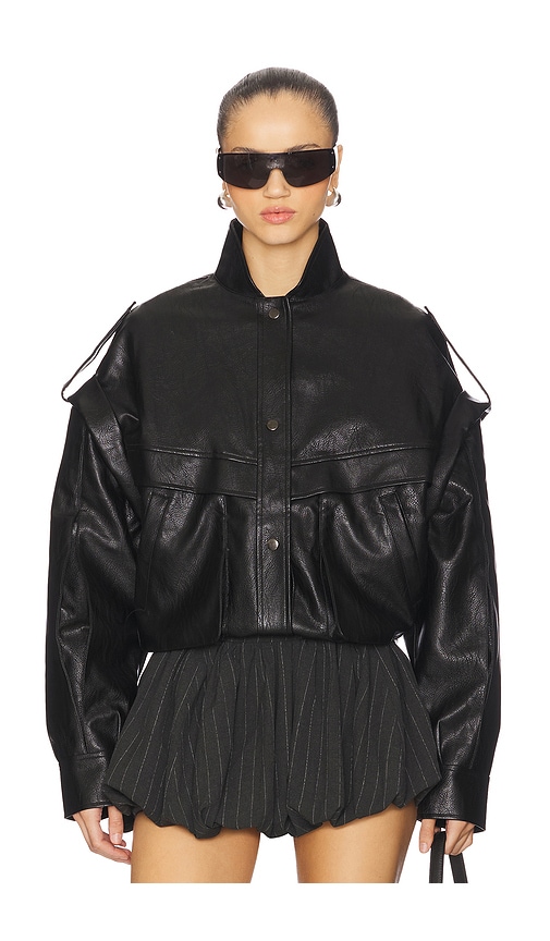 Black bomber jacket in faux leather with a stand collar and front snap closure. The jacket features dropped shoulders with adjustable straps and an elasticized hem. 55% PU. 45%Polyester.Hand wash.Fully lined.Button front closure.2 slip pockets at front.Paneling at arm for comfort.Shoulder button hook