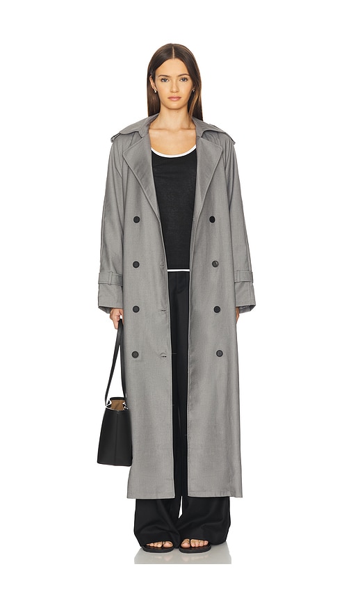 Trench coat is constructed of a woven fabric in a double-breasted silhouette with a notched collar and storm flaps. It features adjustable belt straps at the cuffs and a full-length cut. 80% polyester 20% rayon.Made in China.Hand wash cold.Button closures.Belted waist and cuffs.Two side pockets