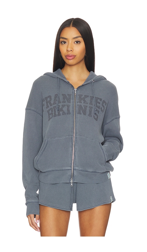 This hoodie is made from a waffle knit fabric. It features a relaxed fit with a zip-front closure and a drawstring hood. 95% cotton 5% spandex.Made in China.Machine wash cold.Front zipper closure.front graphic detail