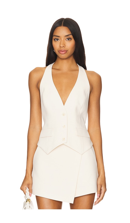 Sleeveless top constructed from a woven fabric, featuring a deep V-neck halter cut. The design incorporates a three-button closure and faux welt pockets at the waist. Shell: 79% recycled polyester 17% viscose 4% elastane Lining: 79% recycled polyester 17% viscose 4% elastane.Made in China.Dry clean only.Front button closure and open back with straps.Front pockets.Item not sold as set.Crepe fabric