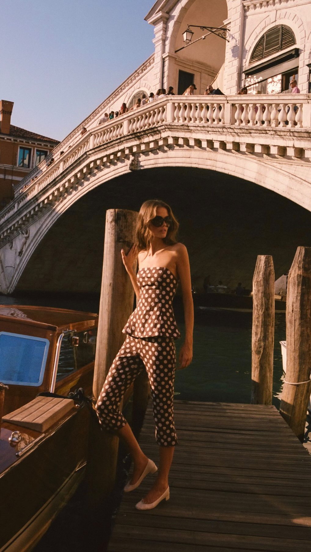 This sleeveless dress features a square neckline and thin shoulder straps. The bodice is constructed from horizontal stripes, while the skirt is vertical. The silhouette appears to be a drop-waist, with a column-like skirt.