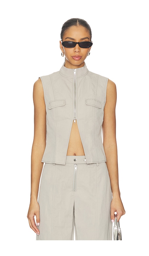 Sleeveless blouse constructed from a lightweight woven fabric. Features a mock neck, front zip closure, and two chest patch pockets. Self: 70% nylon 30% polyester Lining: 97% polyester 3% elastane.Made in China.Hand wash cold.Half zip closure.Lightweight crepe fabric.Front welt pockets.Item not sold as a set