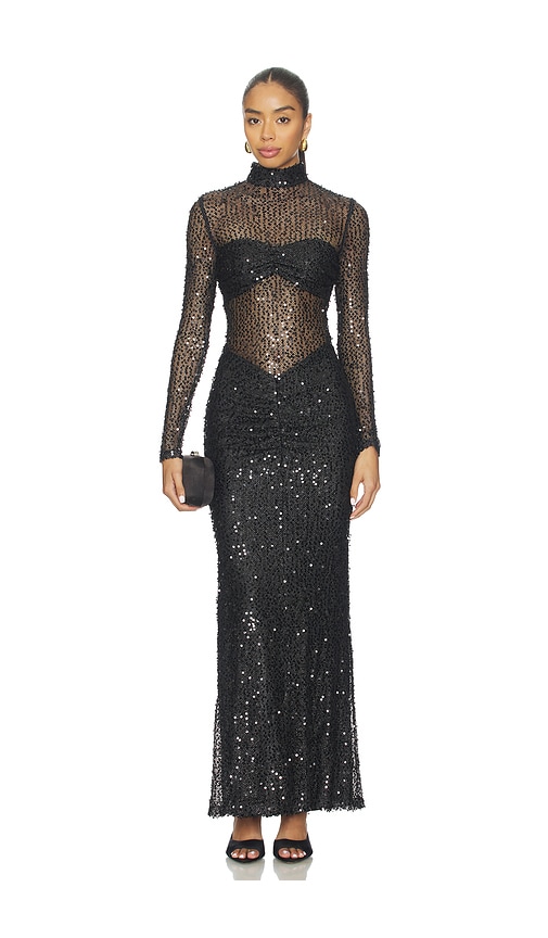 Maxi dress constructed of a sheer mesh base, fully embellished with sequins. Features a high turtleneck, long sleeves, a sweetheart bustier-style bodice overlay, and a gathered skirt. 100% polyester Lining: 88% polyester 12% spandex.Dry clean only.Partially lined.Hidden back zipper closure.Mesh textile with sequins throughout.Lined at chest and skirt