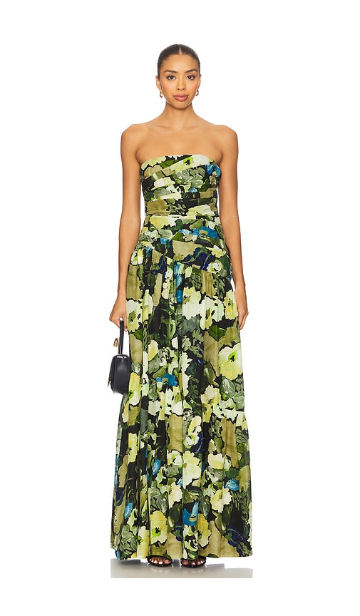 Floral print strapless maxi dress constructed from lightweight woven fabric. Features a ruched bodice and a tiered skirt. Self: 44% viscose 33% linen 23% Tencel™ Lyocell Lining: 100% cotton.Dry clean only.Fully lined.Hidden side zip closure.Side seam pockets`.Pleated bust.Midweight linen fabric.Neckline to hem measures approx 53" in length