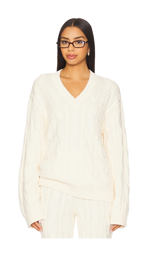 Knit pullover sweater in a cable knit pattern. Features a V-neckline and long sleeves with ribbed knit trim. 60% cotton, 40% acrylic.Hand wash.Ribbed trim.Midweight cable knit fabric