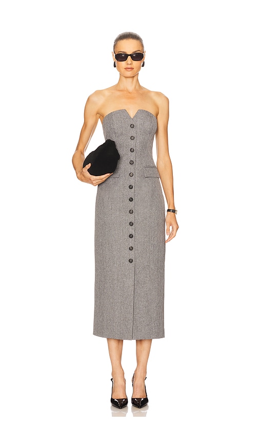 This maxi dress is constructed from a gray tweed-like fabric, featuring a strapless, notched neckline. It has a fitted silhouette with a center front button closure and a single welt pocket at the hip. 97% polyester 3% elastane.Machine wash.Fully lined.Hidden side zipper closure.Neckline to hem measures approx 49" in length