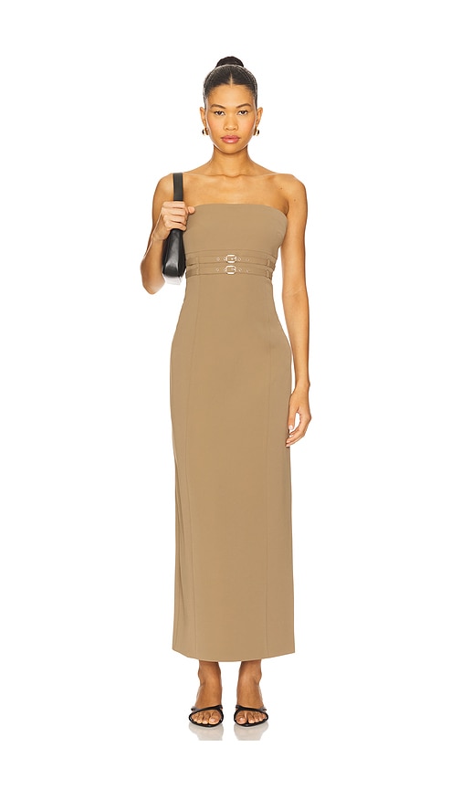 Sleeveless midi dress in a stretch woven fabric with a straight, strapless neckline. The dress features a fitted silhouette with decorative metal ring details at the waist. Self: 100% polyester Lining: 87% polyester 13% elastane.Hand wash.Fully lined.Hidden side zip closure.Front silver-tone buckle accents.Back vent.Midweight crepe fabric.Neckline to hem measures approx 47" in length