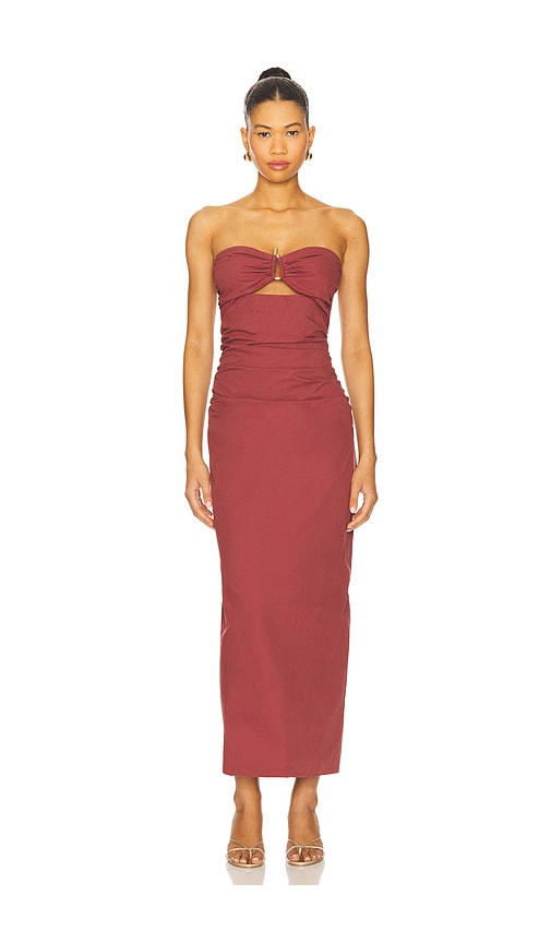 Strapless midi dress in a woven fabric with a straight cut skirt. The bodice features a center front cutout detail with a metal ring accent. Self: 100% cotton Lining: 87% polyester 13% elastane.Hand wash.Fully lined.Hidden back zip closure.Front gold-tone accent and cut-out.Ruched sides.Midweight poplin fabric.Neckline to hem measures approx 46" in length