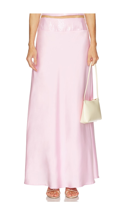 The maxi skirt is constructed from a light pink satin fabric. It features a straight cut with a sequin embellished waistband. Self: 100% polyester Lining: 95% polyester 5% spandex.Made in China.Hand wash.Fully lined.Hidden side zipper closure.Satin textile with sequin waistband.Skirt measures approx 42" in length