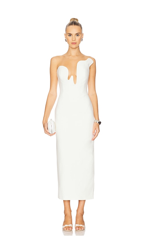Midi dress constructed from a stretch woven fabric in a sheath silhouette. Features an asymmetrical neckline with a deep V cutout and a single long sleeve. Self:65% polyester, 30% viscose, 5% elastane Lining: 97% polyester, 3% elastane.Dry clean only.Midi length.Abstract front wire design.Back split.Boning through bodice