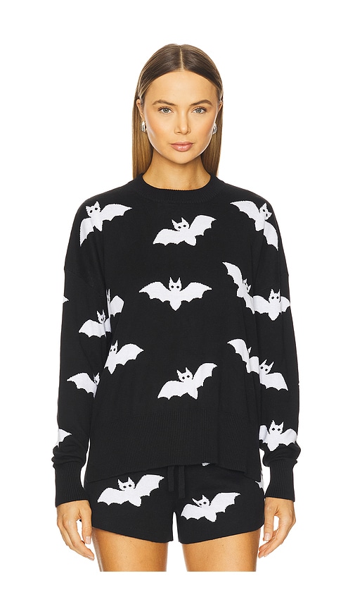 The sweatshirt is a knit construction with a black base and white bat pattern. It features a crew neck, long sleeves, and ribbed trim at the cuffs and hem. 100% cotton.Hand wash