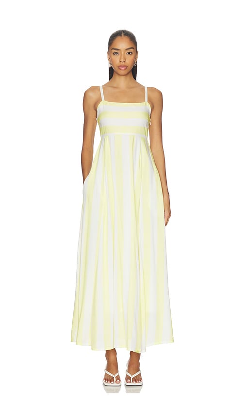 This maxi dress features a striped pattern in a light, possibly cotton or linen blend fabric. It has a fitted bodice with spaghetti straps and a flared skirt with side seam pockets. Self: 100% viscose Lining: 100% cotton.Made in India.Machine wash.Fully lined.Hidden side zipper closure.Hidden side seam pockets.Shirring at back