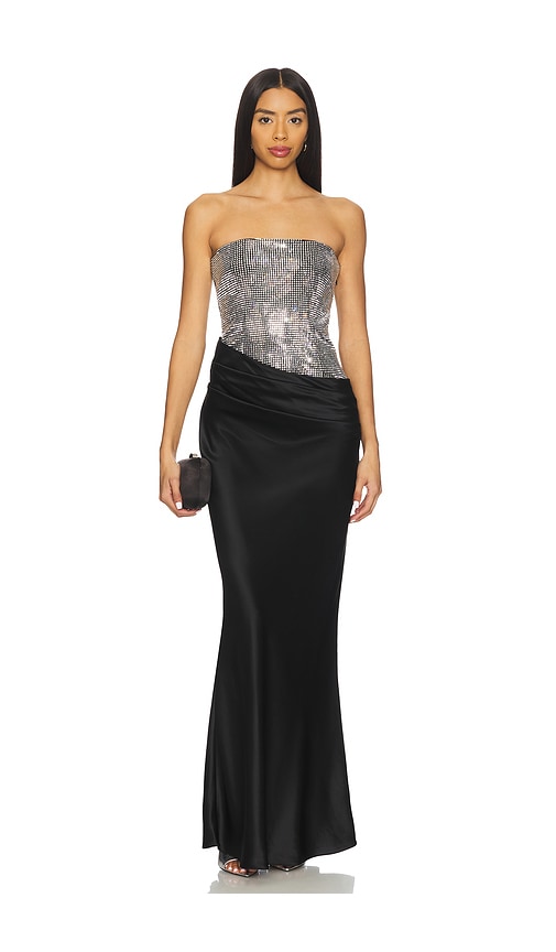 Maxi dress features a strapless, fitted bodice constructed of small, reflective squares. The skirt is a draped, floor-length design in a dark, satin-like fabric. Self: 76% acetate 24% polyester<br<Contrast Fabric: 100% polyester.Hand wash.Partially lined.Hidden side zip closure.Boned bodice.Draped skirt design.Heavyweight satin fabric with embellished rhinestone bodice.Neckline to hem measures approx 54" in length