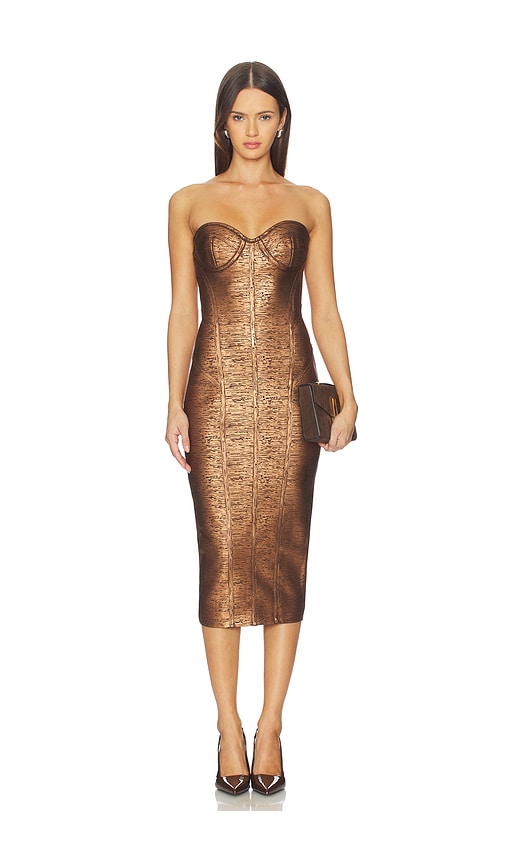 Sleeveless, strapless bodycon dress constructed from a metallic bronze bandage knit. Features a sweetheart neckline with molded cups and a midi-length hem. 100% polyester.Made in China.Dry clean only.Unlined.Back zipper closure.Semi-bandage design and sweetheart neckline.Metallic brown finish.Neckline to hem measures approx 39" in length