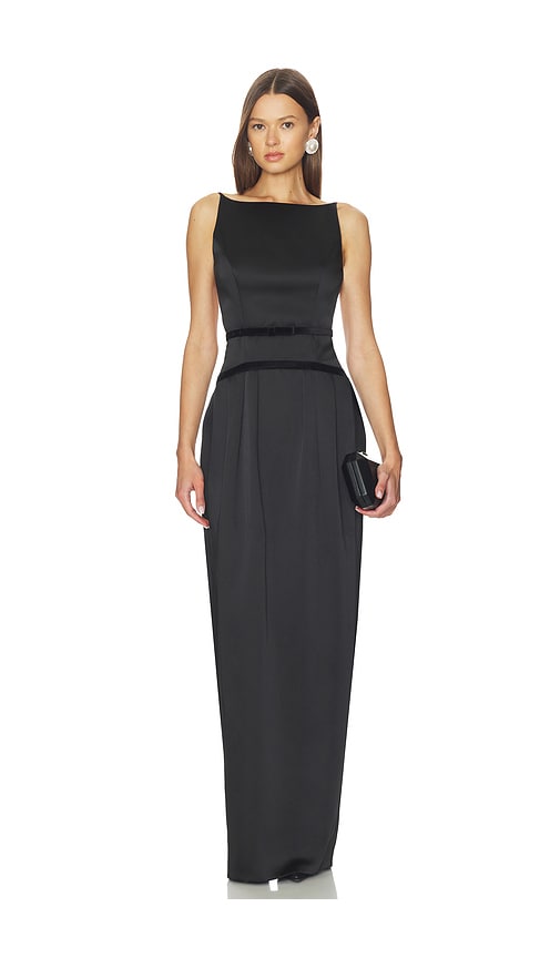 This black dress features a fitted satin bodice with a boat neckline and a velvet ribbon detail at the waist. The skirt is a floor-length, straight cut made of a flowing, lightweight fabric with subtle pleats at the waist. Self: 85% polyester 15% viscose Lining: 97% polyester 3% spandex Belt: 96% polyester 4% spandex.Made in China.Dry clean only.Fully lined.Back zipper closure and waist belt.Open back.Adjustable straps
