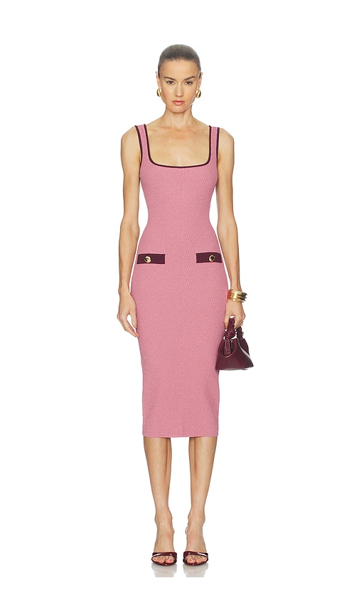 Midi dress constructed from a ribbed knit fabric, featuring a square neckline and a bodycon silhouette. The dress is detailed with contrasting trim on the straps and neckline, and decorative flap pockets with button accents at the hip. 60% rayon 32% nylon 5% metallic fibers 3% spandex.Made in China.Hand wash or dry clean only.Unlined.Pull-on styling.Colorblock contrast on back.Gold faux button detailing