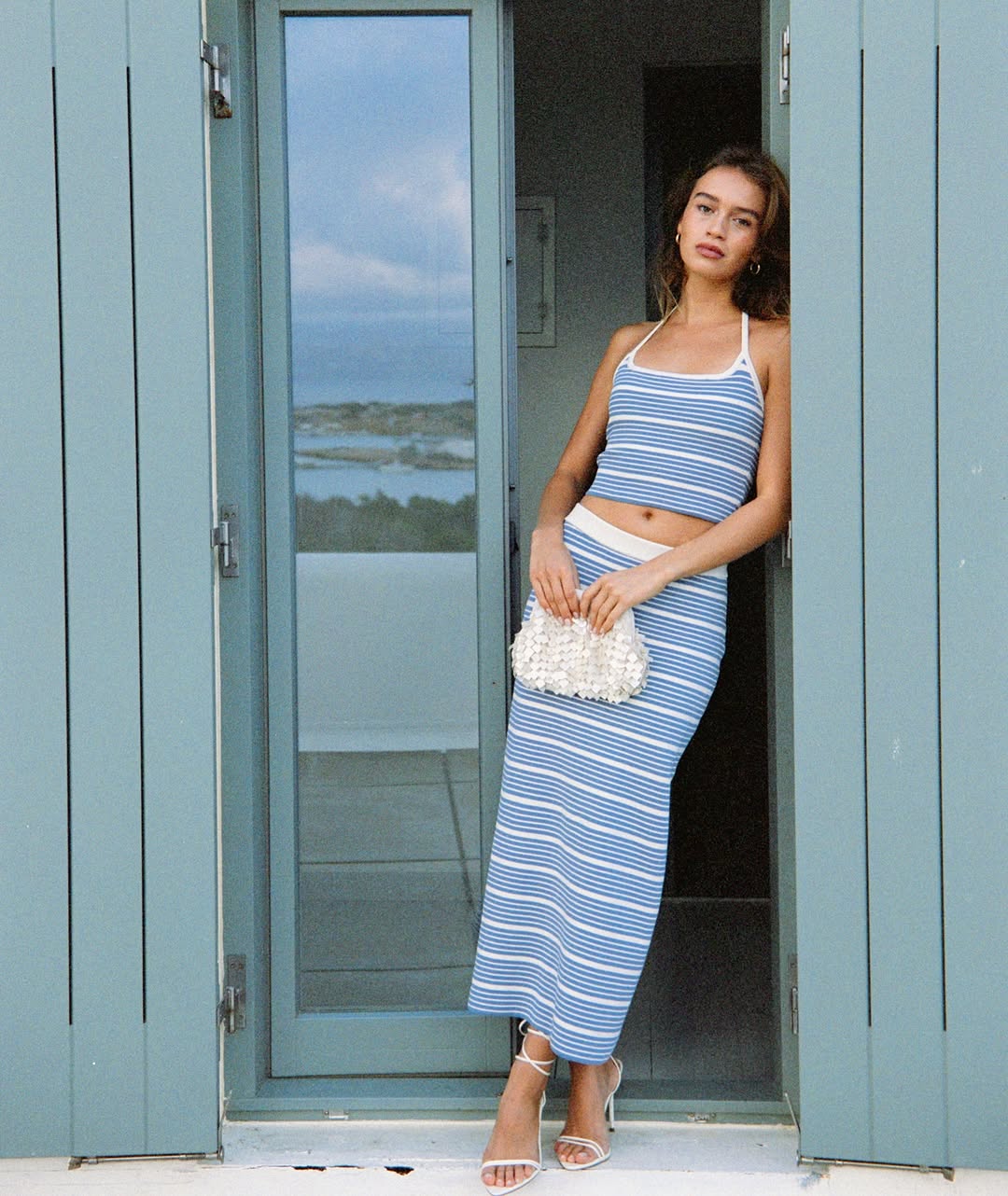 This sleeveless top is crafted from a knit fabric with a striped pattern. It features a halter neckline and a cropped silhouette.