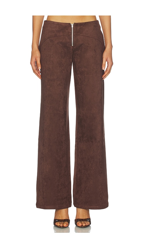 These tailored pants are made from a suede-like fabric. The pants feature a flared leg cut and a front zipper closure. 90% polyester, 10% elastane.Made in China.Hand wash cold.Zip fly.Midweight suede fabric.Item not sold as a set.Faux back pockets.21" at the leg opening