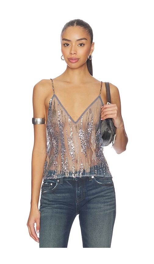 This camisole is crafted from a sheer fabric, embellished with sequins. It features a V-neckline and delicate chain straps. Self: 100% polyester Contrast Fabric: 100% plastic.Made in China.Hand wash cold.Pull-on styling.Garment is intentionally sheer, undergarments will show through. Please note undergarment not included.Embellished mesh fabric