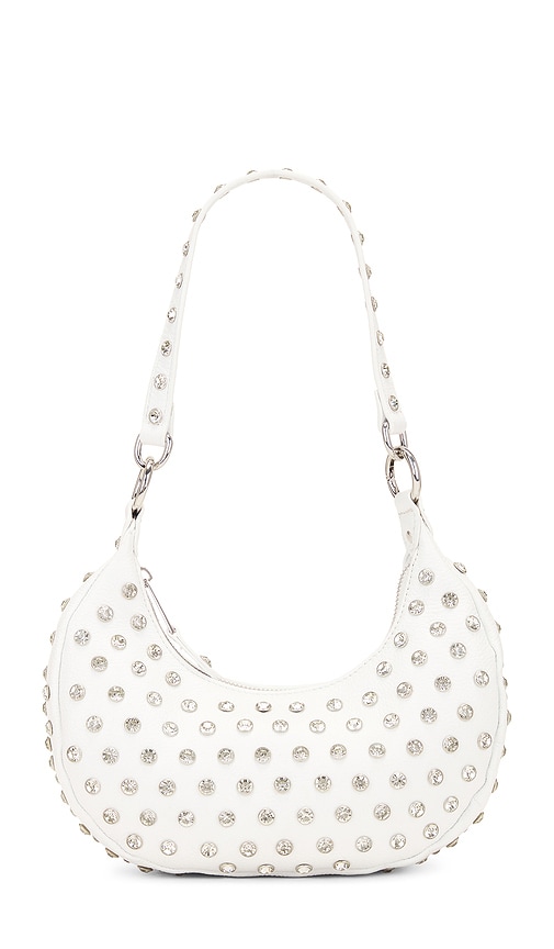 This crossbody bag is crafted from a smooth, white material, possibly leather or a leather-like alternative. The bag features a crescent shape with a studded exterior and a shoulder strap attached with metal rings. Crystal-embellished grained leather exterior with satin lining.Made in China.Top zipper closure.One main compartment.Interior zipper pocket.Interior slip pocket.Detachable crystal-embellished leather shoulder strap.Measures approx 10.5" W x 8.25" H x 2.25" D Shoulder strap with a 11" drop