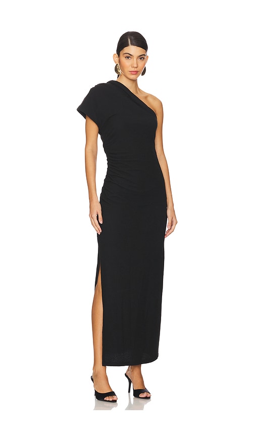 This dress is constructed from a stretch knit fabric. It features a one-shoulder neckline with a side slit and ruched detailing. Jersey textile.Imported.Hand wash recommended.Partially lined.Hidden side zipper closure.One-shoulder design with side slit.Textured jersey fabric