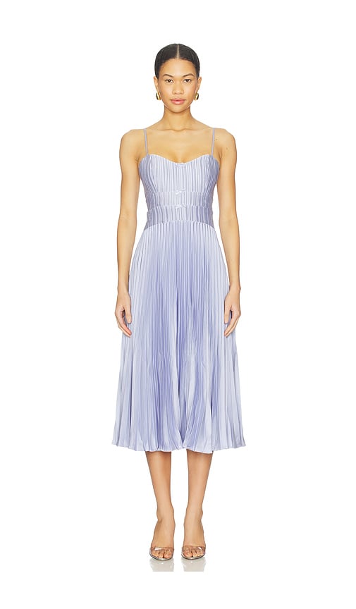 This midi dress is crafted from a pleated, lightweight fabric. It features a fitted bodice with adjustable spaghetti straps and a midi-length pleated skirt. Self & Lining: 100% polyester.Made in China.Dry clean only.Fully lined.Hidden back zip closure.Heavyweight gauze fabric.Adjustable shoulder straps