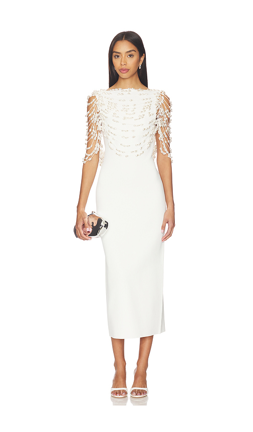 This midi dress is crafted from a smooth, opaque fabric. It features a sheath silhouette with a beaded shoulder detail and a subtle slit at the hem. 60% viscose 40% nylon.Dry clean only.Unlined.Pull-on styling.Detachable faux pearl shawl.Low back design.Heavyweight crepe fabric