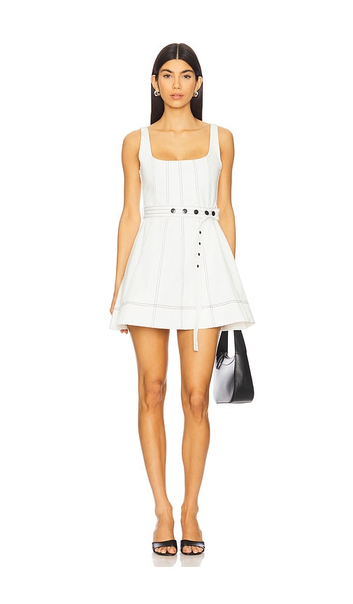This mini dress is crafted from a white fabric with contrasting stitching. It features a fitted bodice with a square neckline and a flared skirt, cinched at the waist with a belt. Self: 100% cotton Lining: 80% polyester 20% cotton.Made in China.Machine wash cold.Fully lined.Back zipper closure.Midweight denim fabric with contrast stitching design.Removable tonal waist belt with snap button closures Side seam pockets