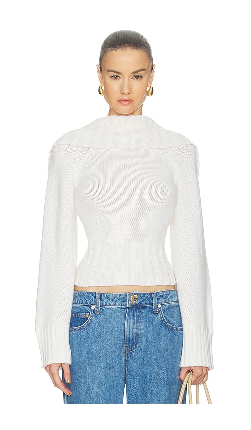 This pullover is knit from a solid white fabric. It features a fitted silhouette with a wide, off-the-shoulder neckline and ribbed cuffs. 55% superfine Merino wool 20% organic cotton 25% recycled nylon.Made in China.Hand wash.Mock neckline with cowl back.Slight flare sleeves.Knit wool fabric