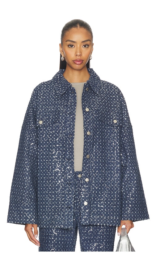 This shacket is made of a textured woven fabric with a sequin embellishment. It features a relaxed, oversized cut with a button-down closure. 70% cotton 30% polyester.Made in China.Dry clean.Front button closure.Chest pockets with button closure.Denim fabric with sequins details throughout.Button closure at sleeve cuffs.Item not sold as a set