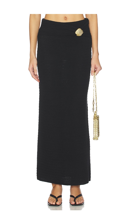 This skirt is crafted from a sheer black lace fabric with floral detailing. It features a maxi length with a high waist and a slit on the front.
