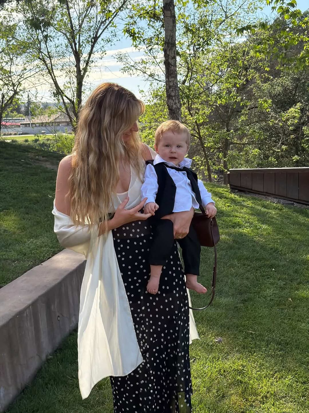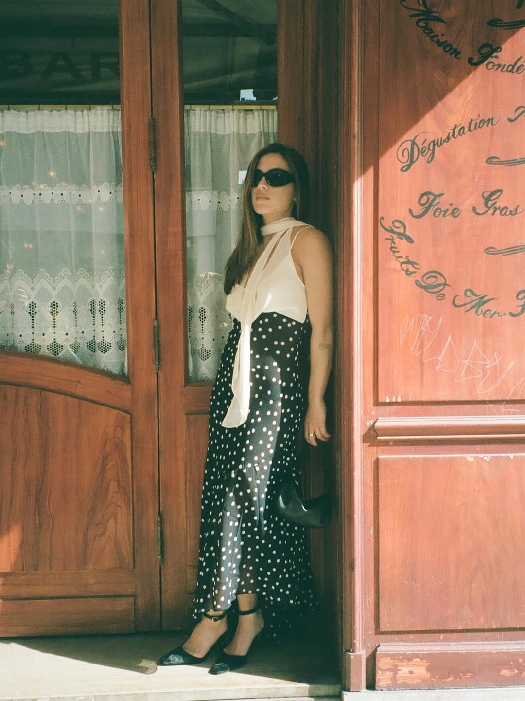 This skirt is made of a lightweight, semi-sheer fabric with a polka dot print. It features a low-rise waist and a midi-length, straight cut.