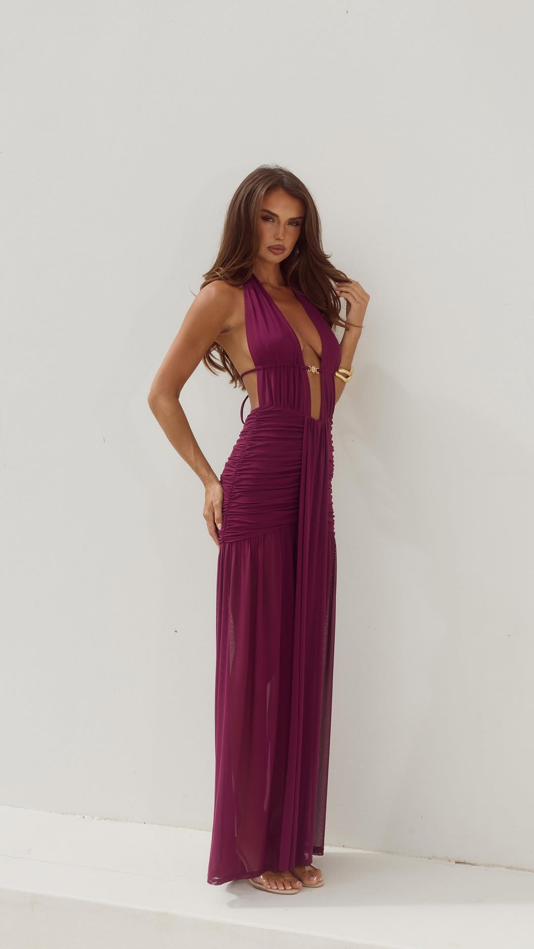The dress is a floor-length gown in a magenta hue, featuring a halter neckline secured with a gold-tone floral accent. The fabric appears to be a smooth, midweight satin with a subtle sheen. The silhouette is a column shape that flares slightly at the hem.