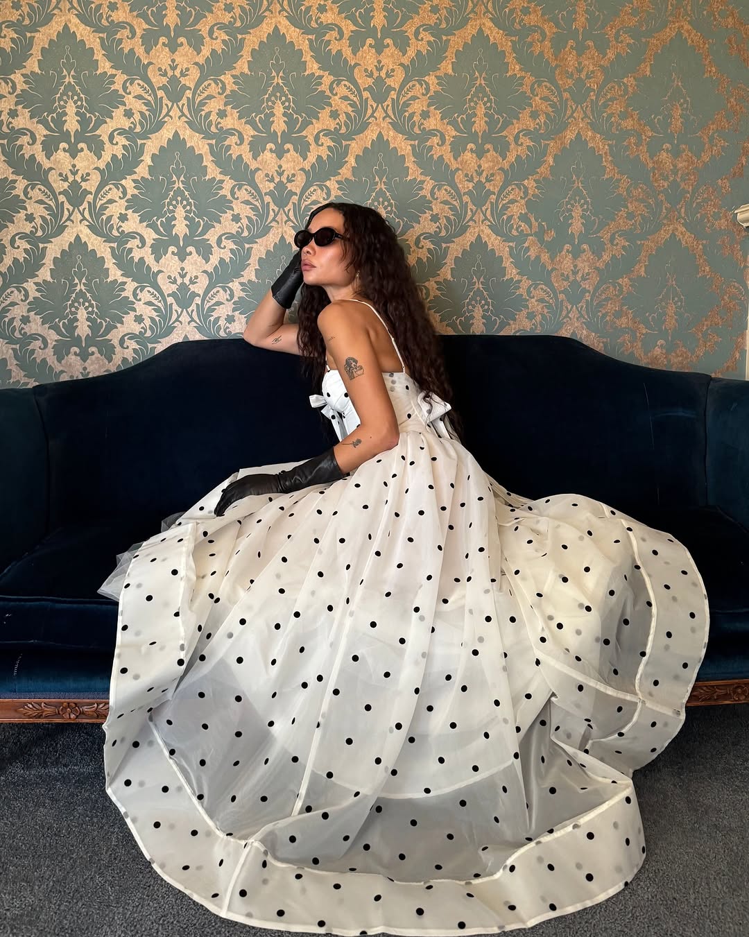 This white dress features a fitted bodice with thin straps and a full, high-low skirt. The fabric appears to be a lightweight, semi-sheer material with a polka dot pattern. The silhouette is defined by a fitted bodice and a voluminous skirt that falls to a midi length in the front and a floor-length in the back.