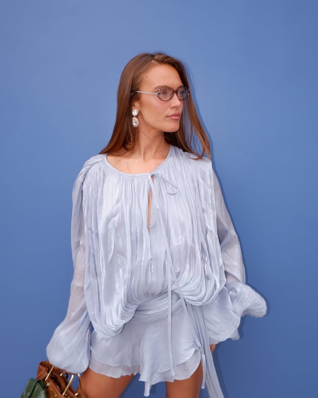 The dress features a loose, draped silhouette with long, voluminous sleeves and a cinched waist. The fabric appears to be a lightweight, semi-sheer material, possibly chiffon, with vertical pleating details. A self-tie closure is visible at the front, and the skirt portion appears to be a mini-length.