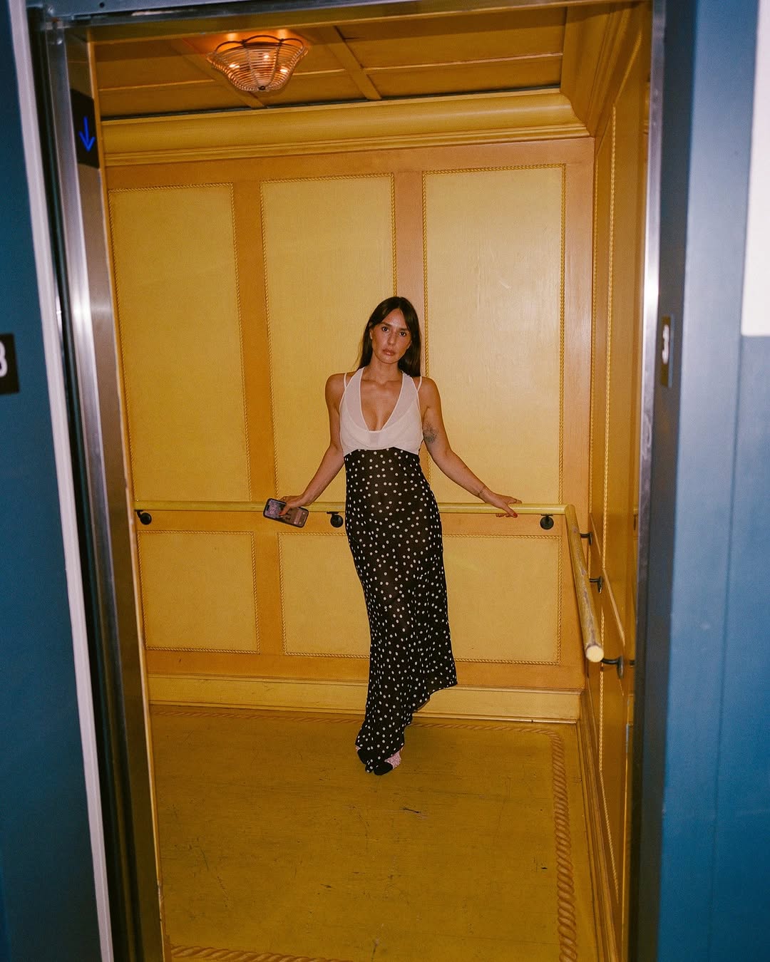 Spaghetti strap gown constructed from lightweight, semi-sheer chiffon with a polka dot print. Features a draped neckline, a matching scarf detail, and a tiered, ruffled hem.