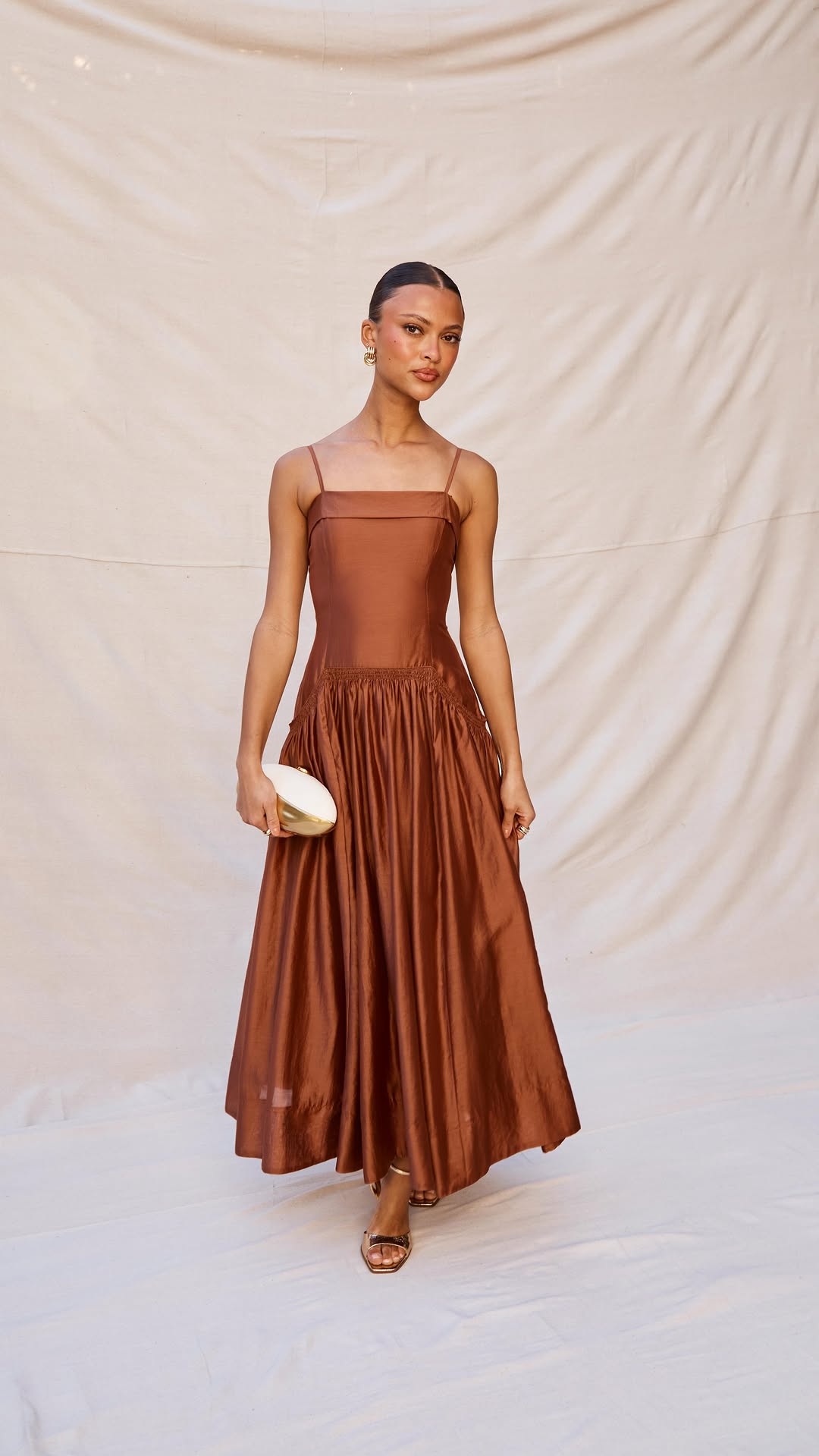 This midi dress is constructed from a smooth, satin-like fabric in a solid color. It features a cowl neckline, spaghetti straps, and a side slit.