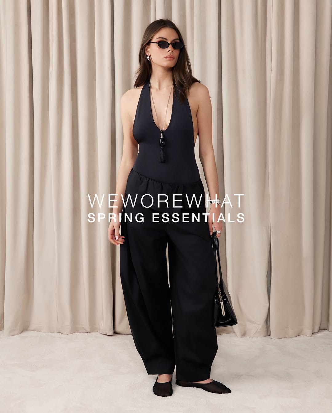 This black dress features a deep V halter neckline and is constructed from a soft, draping fabric. The dress has a gathered detail at the midsection and an asymmetrical hemline.